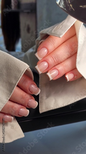 The beauty of the natural nails. Perfect clean manicure. New trendy nail arts on young women hand. Beautiful nail polish in hand