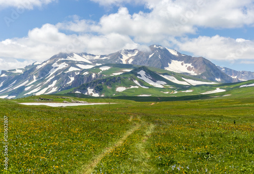 the beginning of the spring period in mountainous areas, remnants of snow cover and panoramic views of verdant ridges and meadows