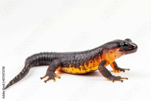 the beside view Alpine Newt, left side view, white copy space on right, dutch angle view, isolated on white background