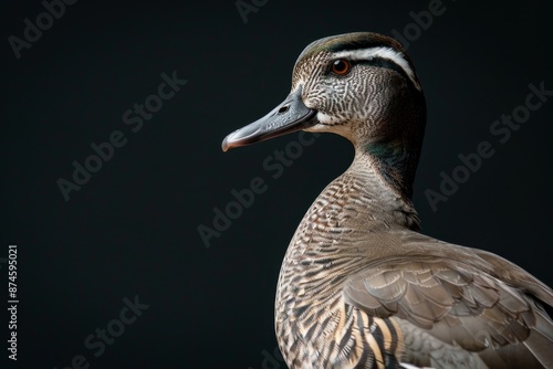 the beside view Australian Wood Duck, left side view, white copy space on right, isolated on black background