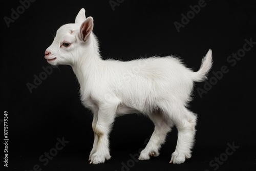 the beside view baby Domestic Goat standing, left side view, low angle, white copy space on right, Isolated on black Background