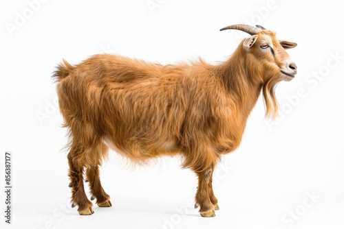 the beside view Etawah Goat standing, left side view, white copy space on right isolated on white background