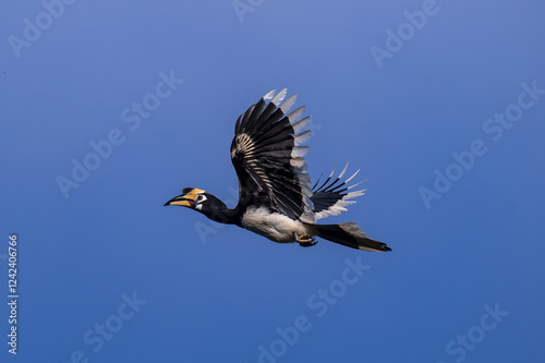 The bill and large hump are yellow. The face is black. The throat is white or yellowish-white. The body is black. The wings are black with a wide yellow stripe running down the middle of the wings.