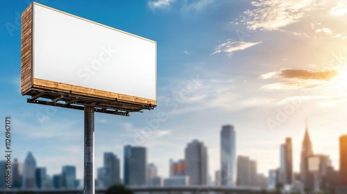 The blank billboard stands tall against the city backdrop, offering a prime space for your message to shine