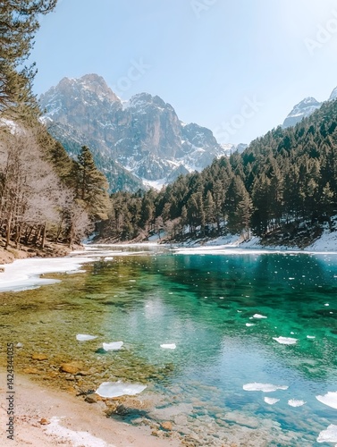 The blue ice layer melted by glaciers in spring and the thawed lake surface