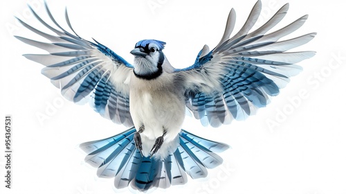 The blue jay, or cyanocitta cristata, is a corvid passerine bird found in eastern North America, captured mid-flight with widespread wings and feathers against a white backdrop.