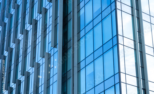 The blue sky is reflected in the windows of a modern office building. Architecture and exterior of contemporary houses