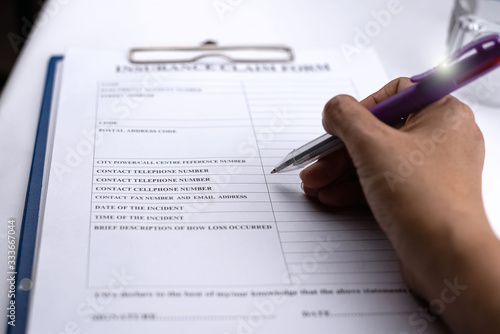 The blurry light design background of human hand writing on blurry Insurance claim form,Lens flare effect