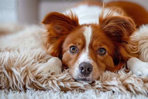 The border collie breed lies on a fluffy carpet, bedspread. The dog is resting
