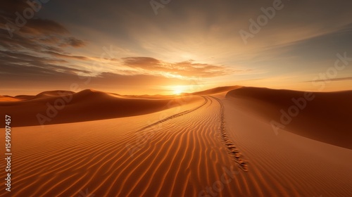 The breathtaking sunset over a tranquil desert landscape paints the sand dunes in warm colors, evoking themes of serenity and the beauty of nature.
