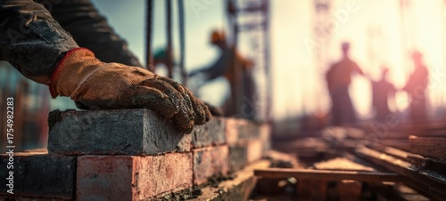 The Bricklayer's Gloved Hand Laying Bricks on a Construction Site at Sunrise