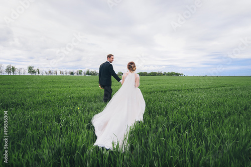 The bride and groom are walking along the field, holding hands. A great spring wedding day. Enamored newlyweds go by the hands on the green field. Wedding of the beautiful bride and groom.