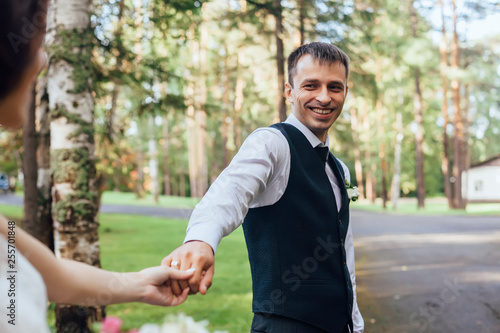 The bride and groom walk along the edge of the green forest