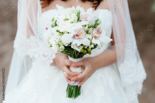 the bride holding a bouquet. wedding flowers. soft focus.