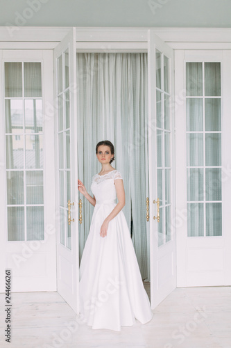 The bride in the white Studio with a bouquet. Wedding in the European style fine art.