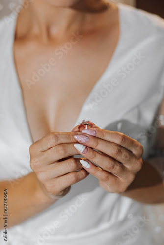 The bride is holding a luxurious gold ring with a diamond. Beautiful hands and manicure. Open neckline. Cropped photo
