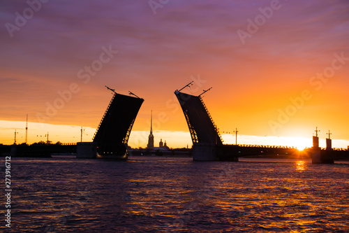 The bridges are erected at dawn in St. Petersburg. Peter Romance. Sight of Peter. Neva River. Dawn in the city. White Nights.