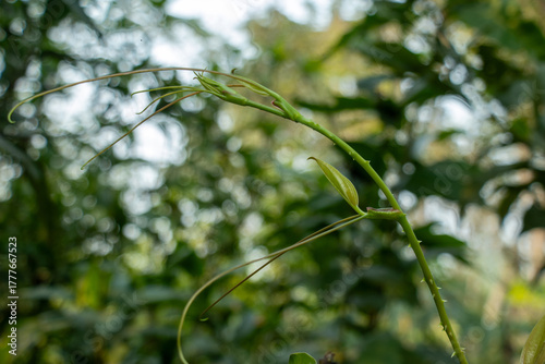 The bright green shoot tapers off into thin, elegant tendrils at the tip