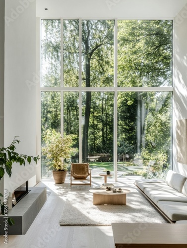 The bright living room features expansive windows that provide a view of the vibrant garden outside, creating a refreshing ambiance. Generative AI