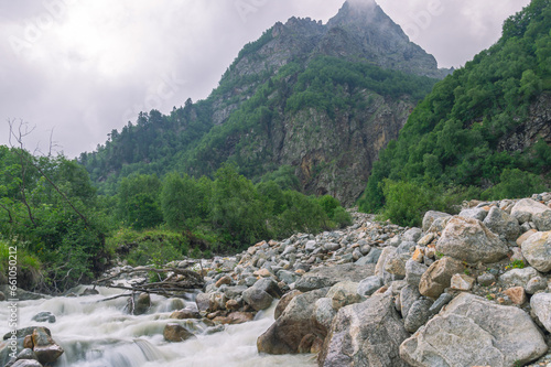 The bubbling glacial-clear water of a mountain river with large stones high in the mountains. Environmentally friendly water flows down from a glacier in the mountains. Nature in the mountains.