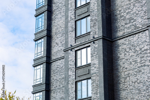 The building's façade is constructed of gray brick with clear geometry. Rectangular aluminum windows with white frames create a modern and understated style.