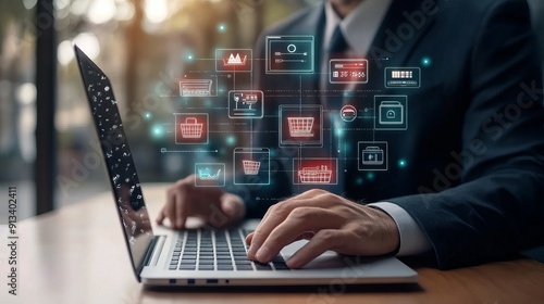 The business ecommerce concept features a businessman using a laptop with online shopping icons for internet shopping online purchases ecommerce stores online business and shopping on