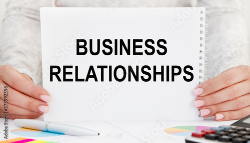 The businessman puts a business card in his pocket with the inscription BUSINESS RELATIONS.