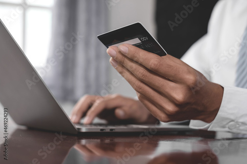 The businessman's hand is holding a credit card and using a laptop for online shopping and internet payment