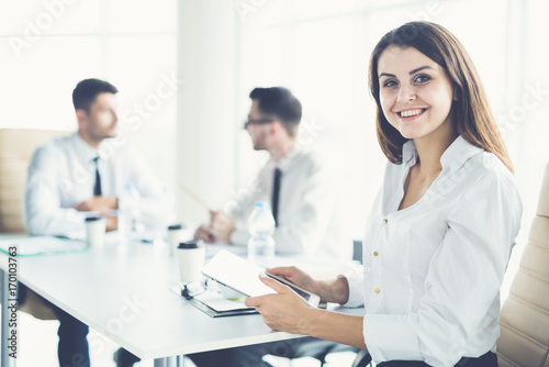 The businesswoman in glasses hold a tablet and sit near colleagues