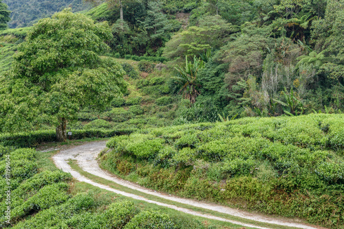 The Cameron Highlands, mountains and tea plantations, view over the rolling terrain with lush green foliage.
