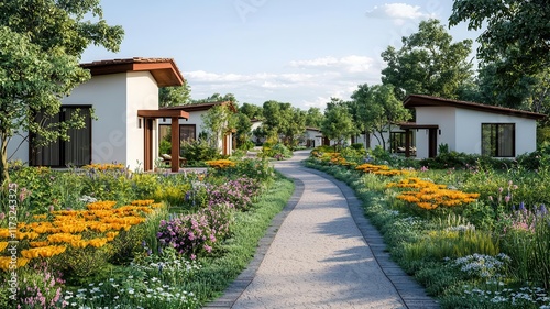 The Care Economy Concept, Pathway with gardens and modern houses on a sunny day