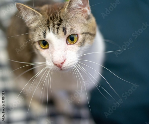 The cat looks into the frame. Mustard or yellow cat eyes. Cat ears. Gorgeous cat whiskers. White wool. Snow-white breast of a cat. The cat is ordinary. The cat is beautiful.