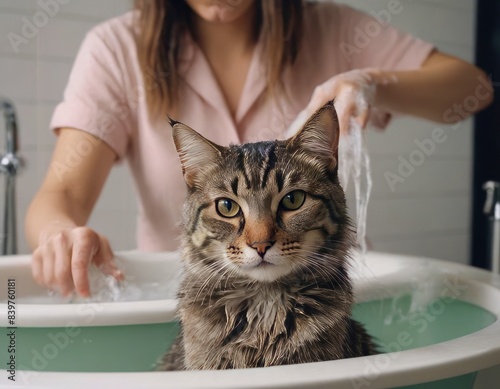 The cat sits in the bathtub while he is being washed with a sponge. concepts of pet care, hygiene and caring for pets, demonstrating tenderness and attention to pets