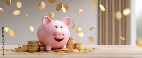 The cheerful piggy bank with golden coins celebrates savings and financial success.