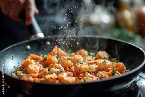 The chef cooks rice with shrimps in a frying pan on a black background. Levitation. Sea food recipes, seafood preparation. Recipe book, food blog
