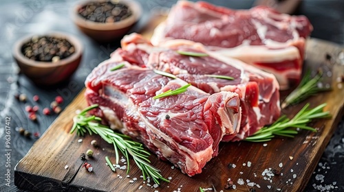 The chef prepares steak from beef, lamb or other red meat. A large piece lies on a cutting board, the master slices it and seasons it with spices. Illustration for advertising, marketing, presentation