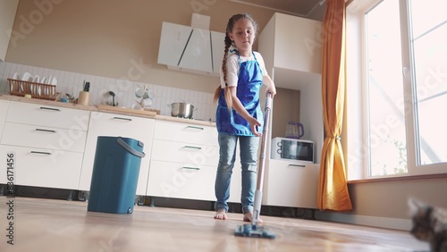 the child baby washed the floors. happy family kid dream concept. daughter washed the floors with a mop in the kitchen in an apron helps mom. mom asked the child girl to indoors mop the floors