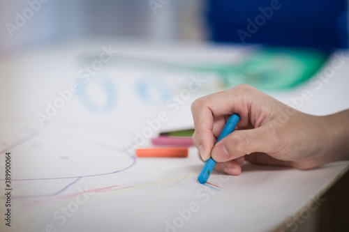The child is painting with crayons on white paper.