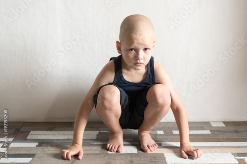 The child is upset because of problems in the family. Sits at the wall and protects himself with his hands.