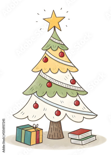 the christmas tree with stars, white background, flat illustration