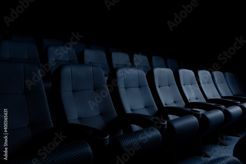 The cinema hall is empty, new blue seats in the auditorium or cinema