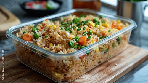The clear Tupperware container contains frozen fried rice, Generative AI.