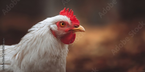 The close-up portrait of a beautiful white chicken displaying vibrant colors.