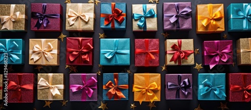 The colorful gift boxes adorned with ribbons are arranged artistically evoking a festive atmosphere for Christmas and New Year Presented from a top view the image offers ample copy space