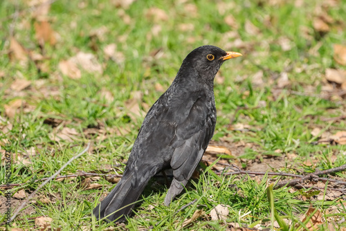 The common blackbird (Turdus merula) jumping on the grass. It is a species of true thrush. It is also called the Eurasian blackbird or simply the blackbird.