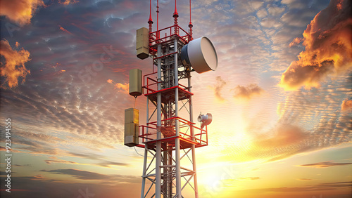 The communication tower rises high as the sun sets, casting vibrant colors across the sky while silhouetting the structure against a breathtaking backdrop
