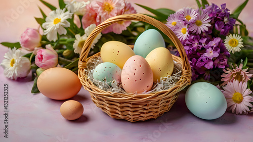 The concept of a bright Easter holiday. Beautiful background with Easter eggs in a wicker basket and spring cherry blossoms.