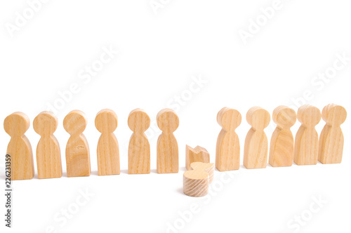 The concept of a weak link. Did not give up to expectations and did not fulfill the task. Weak player, worker for dismissal. A row of wooden people and a broken figure of a person among them.
