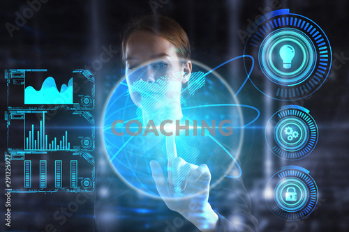 The concept of business, technology, the Internet and the network. A young entrepreneur working on a virtual screen of the future and sees the inscription: Coaching