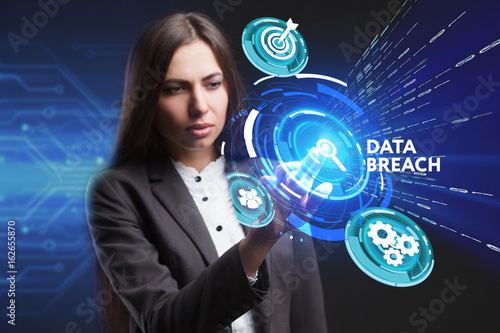 The concept of business, technology, the Internet and the network. A young entrepreneur working on a virtual screen of the future and sees the inscription: Data breach